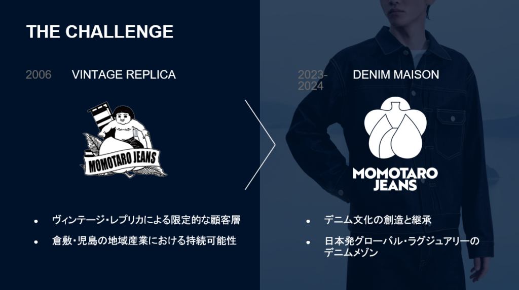 岡山県で1992年に創業したアパレルメーカーであるジャパンブルーが展開する「MOMOTARO JEANS」は、地元(倉敷市児島)のデニム生地を使用し、これまで熱心な愛好家から支持されてきた。しかし、顧客層や市場は限定的であったことから、2023年にリブランディングに着手。使い捨てではない10~20年のロングライフブランドへと転換を図り、持ち主とともに育っていくライフタイムパートナーとしてブランドを差異化する戦略に舵を切った。