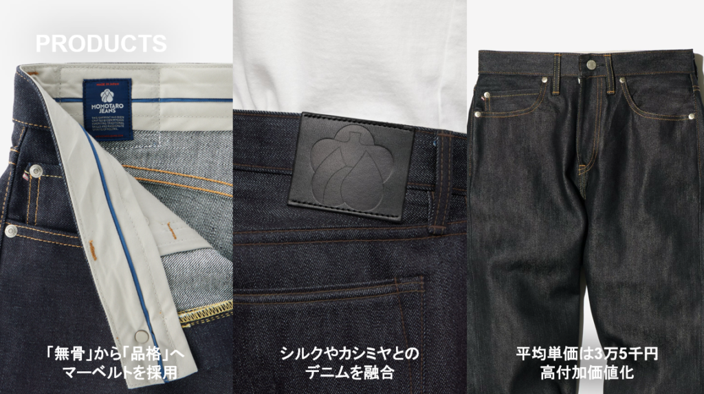 近年の地域産業の衰退を受け、国産ジーンズ産業の持続可能性向上を事業課題として、リブランディングを開始した「 MOMOTARO JEANS」 は、新素材デニム(カシミヤ/シルク混紡など)の開発など新たな取り組みを通じて製品のロングライフ化を推進し、日本発のラグジュアリーブランドとして世界に向けた挑戦を続けている。