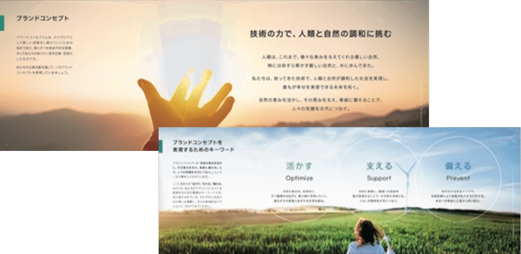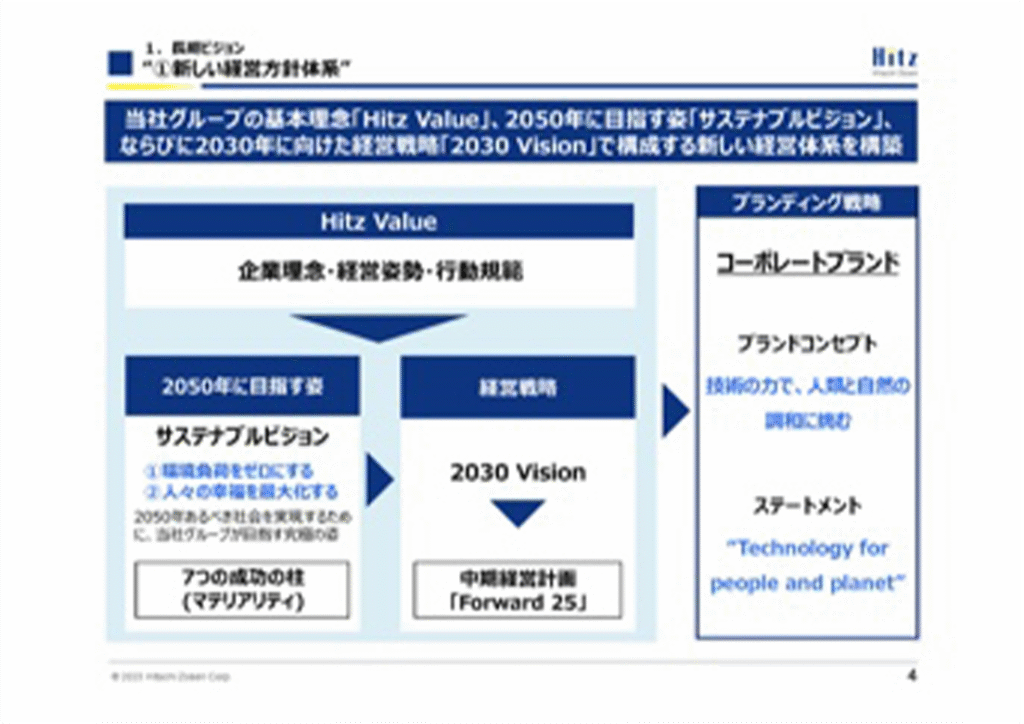 カナデビアは、現中期経営計画において「環境セグメント」、「機械・インフラセグメント」、「脱炭素化セグメント」の既存セグメントに加え、「脱炭素化(CN)事業」、「資源循環(CE)事業」、「安全で豊かな街づくり」、「水事業」の4事業を今後の成長事業として定めている。そうした今後の目指す事業の在り方をもとに、ブランドコンセプトを「技術の力で、人類と自然の調和に挑む」と定義し、Hitz Value、2050年に目指す姿「サステナブルビジョン」、2030年に向けた経営戦略「2030Vision」における新しい経営方針体系に落とし込んでいる。また、そうした将来の経営の意思や方向性をより分かりやすく可視化するために、2024年10月に社名を「日立造船」から「カナデビア」に変更、あわせてグループブランド体系も整備し、多くの国内外グループ会社も「Kanadevia」ブランドに統一した。ここでのポイントは、決して最初から「社名変更ありき」でスタートしたのではなく、ブランド戦略を構築して初めてそのギャップを埋めるための手段として社名変更の意思決定がなされたことである。また、ブランディングの目的を企業理念体系を体現できる人材づくり、人的資本経営に資する取り組みと位置付けている点にある。
