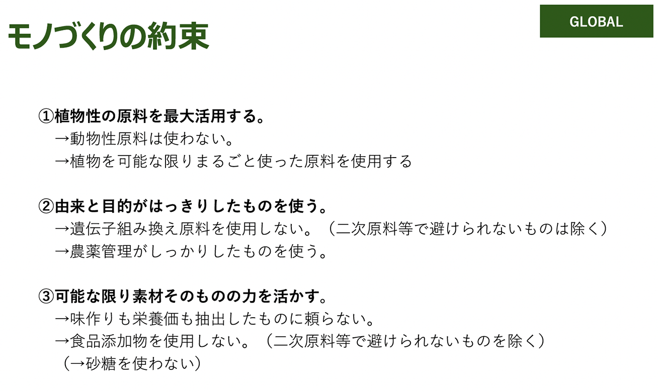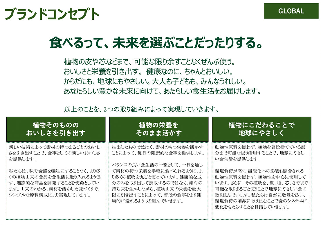 地球温暖化や環境負荷による畜産の敬遠等、すでに顕在化しつつある社会課題を踏まえて、「美味しさと健康の一致」、「ヒトと社会と地球の健康に貢献する新たな食生活をグローバルに展開していく」という指針のもと、ミツカンが過去から持っていた技術をベースに新たな価値を生みだすという技術開発と、「食物由来のナチュラルな品質」「素材の力を引き出す」という考えのもと、社内外のメンバーを集めた協働議論を重ねた結果、「食べ物を、普段食べない部分まで可能な限り丸ごと全部おいしく提供するZENBブランド」としてその考え方をまとめ上げた。 環境負荷の高い動物性の食材は使わず、植物をベースに可能な限り丸ごと全部使い、添加物に頼らず素材の持つおいしさや栄養を引き出すことにこだわる商品の開発を継続的に展開しているが、それは商品に留まるものではなく、「365日×6食」を提供することを目指した、未来の新しい食生活そのものを提案しているのである。