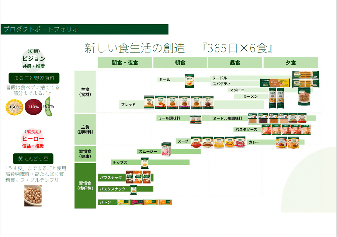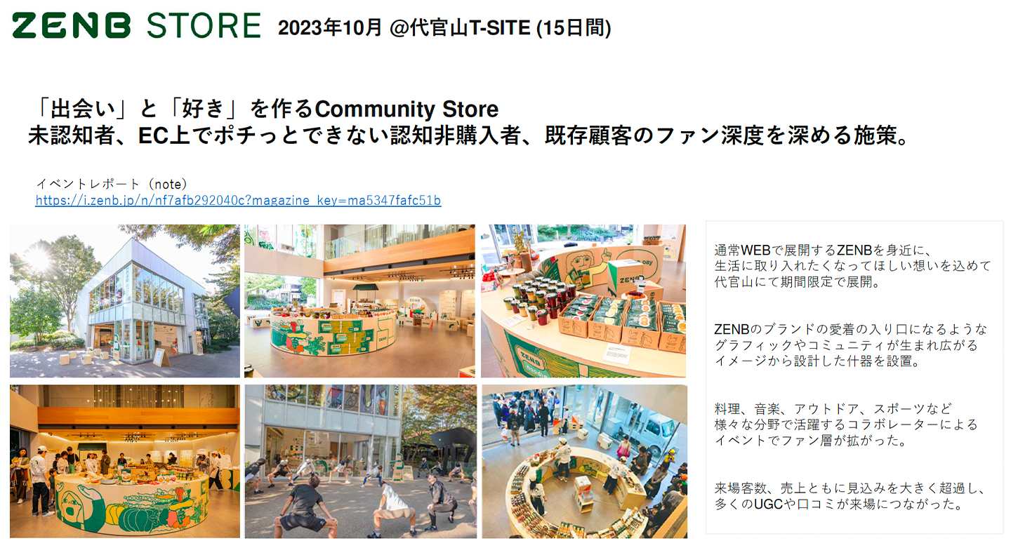 「『食べる』のぜんぶを、あたらしく。」というコンセプトのもと、それを実証する商品ポートフォリオの拡充をはじめ、通販をメインチャネルとする中で、ZENBの思想をリアルに実感できる体験の場として、ポップアップ店舗、「野菜とデザイン展」、商品体験ができる「ZENBカフェ」「ZENBデリ」「ZENBマルシェ」等様々な場を提供している。組織運営においては、「ZENBという事業の成り立ちとブランドの考え方に基づいた企業活動そのものがブランディングであり、戦略の鑑となっている構造」をその根底の考え方に据えている。つまり、特別な取り組みや組織を設けるのではなく、あえて通常の機能組織(R&D、マーケ、セールス、バックオフィス・・)それぞれの機能組織の方針に、ブランドブックに明文化された内容が組み込まれており、一人一人の業務そのものがZENBのブランド戦略の具現化と事業の成長に紐づくことを可視化しているのである。
